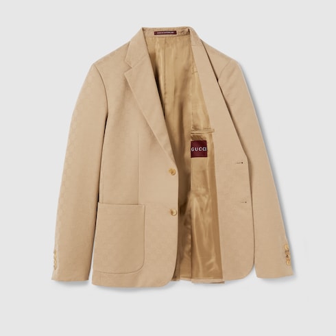 Die Anzüge und formellen Designs aus der Pre-Fall 2025 Kollektion sind von Freizeitmode inspiriert und rücken neue Silhouetten und Schnitte in den Fokus. Charakteristische Elemente treffen dabei auf elegante Details. Dieses Jackett ist aus hellbeigefarbenem GG Baumwollgabardine-Jacquard gefertigt.
