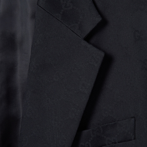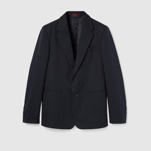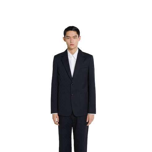 Die Anzüge und formellen Designs aus der Pre-Fall 2025 Kollektion sind von Freizeitmode inspiriert und rücken neue Silhouetten und Schnitte in den Fokus. Charakteristische Elemente treffen dabei auf elegante Details. Dieses Jackett ist aus dunkelblauem GG Baumwollgabardine-Jacquard gefertigt.