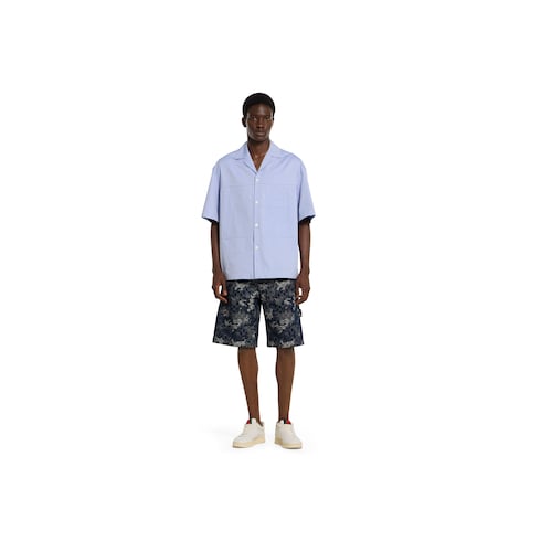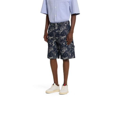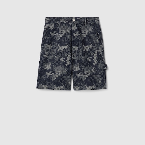 Die Pre-Fall 2025 Kollektion umfasst Designs aus Denim mit raffinierten Details, die Alltagslooks eine besondere Note verleihen. Diese Shorts aus dunkelblauem und elfenbeinfarbenem GG Denim-Jacquard mit Marmor-Effekt werden von einem Etikett aus Naplakleder akzentuiert.