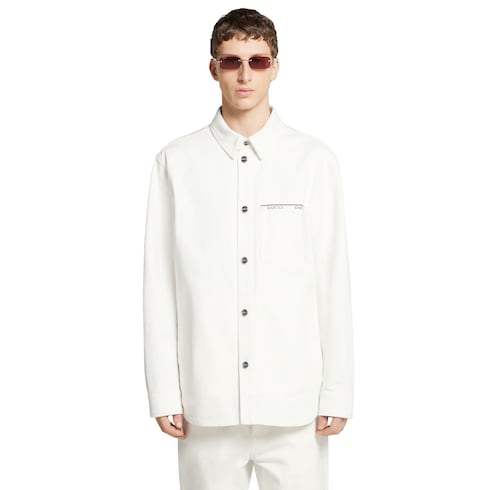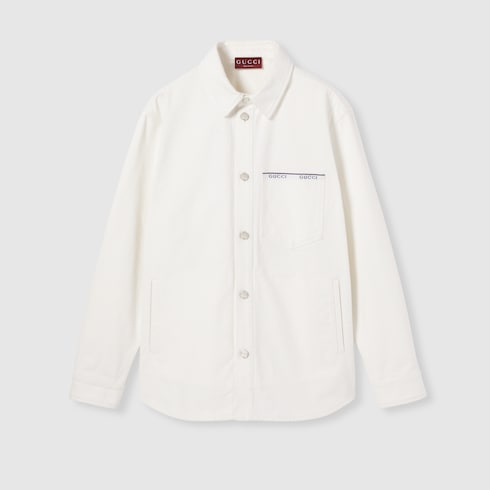 Details wie die Gucci Webkante oder der Gucci Vintage-Logo-Print verleihen Alltagslooks ein urbanes Flair. Dieses Modell aus weißem Baumwolldenim zeichnet sich durch Gucci Metallknöpfe und ein Gucci Webkanten-Detail aus.