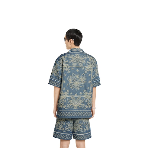Die Pre-Fall 2025 Kollektion umfasst Designs aus Denim mit dezenten Details, die Alltagslooks eine besondere Note verleihen. Bei diesem Hemd aus blauem und elfenbeinfarbenem GG Denim-Jacquard mit Waschung und Blumenmotiv sorgen Gucci Metallknöpfe für einen besonderen Akzent.
