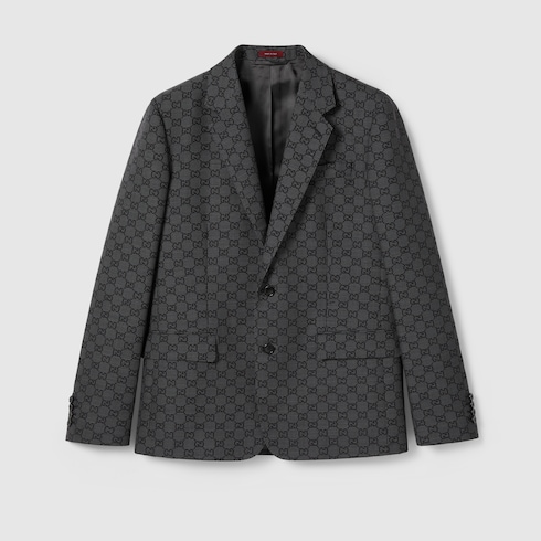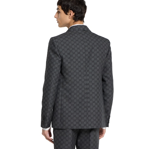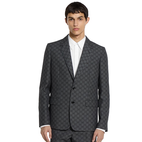 Die Pre-Fall 2025 Kollektion umfasst Designs in gedeckten Schwarz-, Grau- und Grüntönen, auf denen geprägte Logos und andere aufwendig gearbeitete Details auf besondere Weise in den Fokus rücken. Dieses einreihige Jackett in Grau und Schwarz ist aus technischem GG Wolljacquard mit Vichykaro gefertigt.