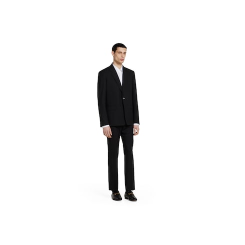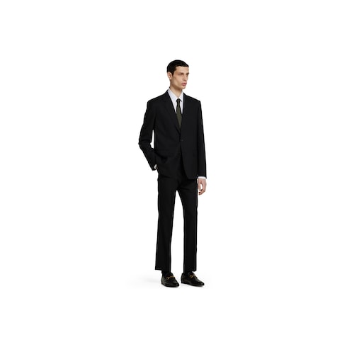 Die Anzüge und formellen Designs aus der Pre-Fall 2025 Kollektion sind von Freizeitmode inspiriert und rücken neue Silhouetten und Schnitte in den Fokus. Charakteristische Elemente treffen dabei auf elegante Details. Dieser Anzug erscheint in einem Design aus schwarzer Wolle.