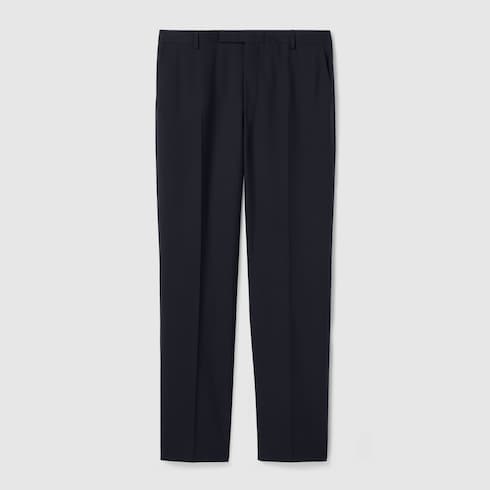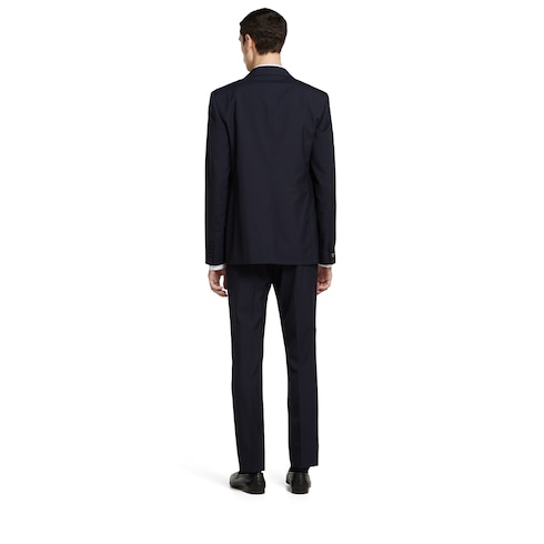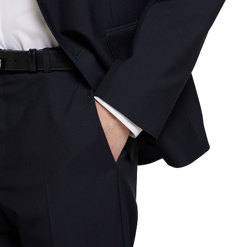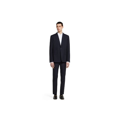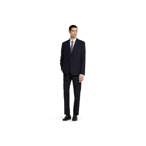 Die Anzüge und formellen Designs aus der Pre-Fall 2025 Kollektion sind von Freizeitmode inspiriert und rücken neue Silhouetten und Schnitte in den Fokus. Charakteristische Elemente treffen dabei auf elegante Details. Dieser Anzug erscheint in einem Design aus dunkelblauer Wolle.