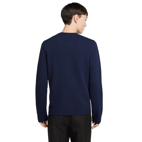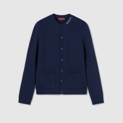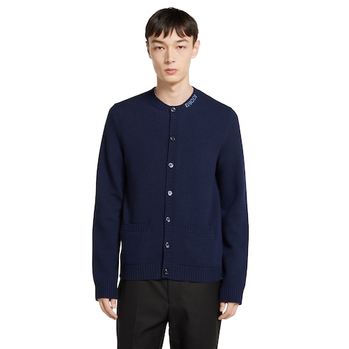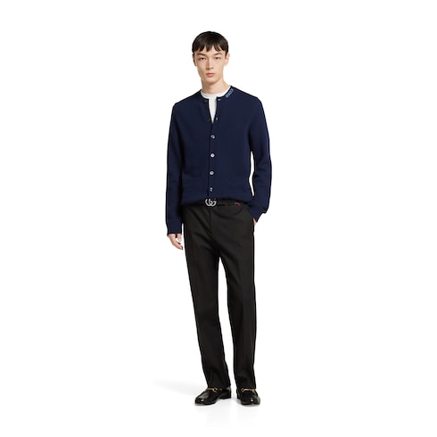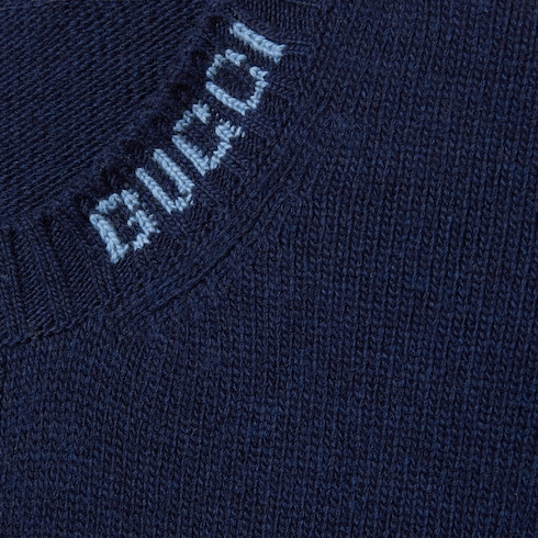 Die Pre-Fall 2025 Kollektion umfasst essenzielle Silhouetten mit symbolträchtigen Details für den Tag und den Abend. Dieser Cardigan aus dunkelblauem, gefilztem Wollstrick erhält durch eine Gucci Intarsie einen besonderen Akzent.