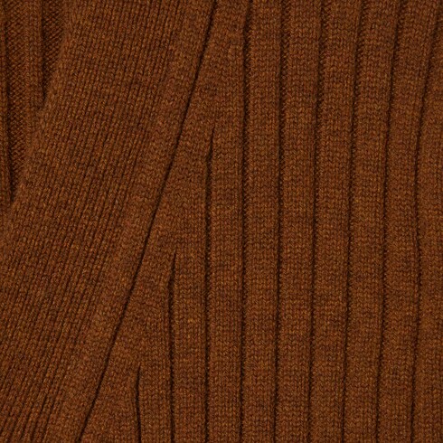 Die Pre-Fall 2025 Kollektion umfasst essenzielle Silhouetten mit symbolträchtigen Details für den Tag und den Abend. Dieser Cardigan aus braunem, geripptem Woll-Kaschmirstrick erhält durch eine Gucci Intarsie einen besonderen Akzent.