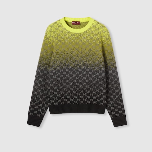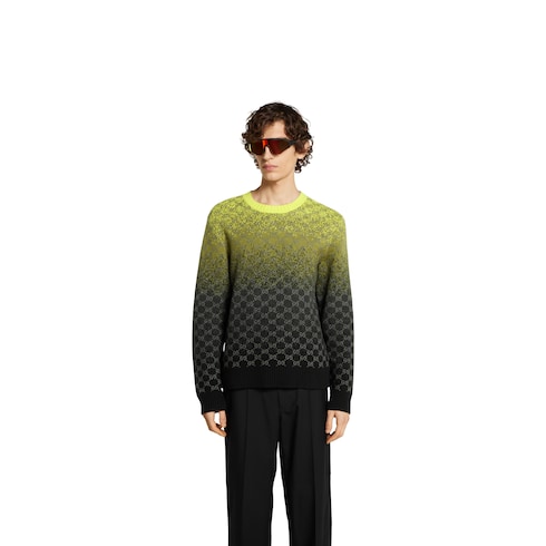 Präzise gestaltete Farbverläufe lassen die Struktur der verwendeten Materialien und des unverkennbaren GG Motivs in den Vordergrund treten. Bei diesem Rundhalspullover trifft GG Jacquard aus Wolle und Kaschmir auf ein Farbverlaufdesign von Limettengrün zu Schwarz.