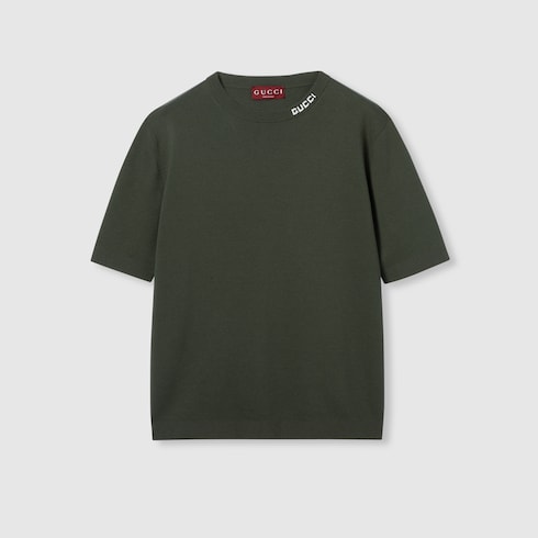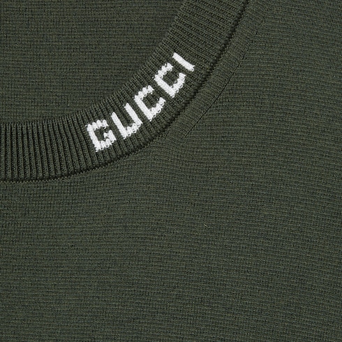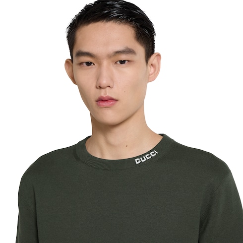 Die Pre-Fall 2025 Kollektion umfasst essenzielle Silhouetten mit symbolträchtigen Details für den Tag und den Abend. Dieses T-Shirt aus waldgrünem Seiden- und Baumwollstrick erhält durch eine Gucci Intarsie einen besonderen Akzent.