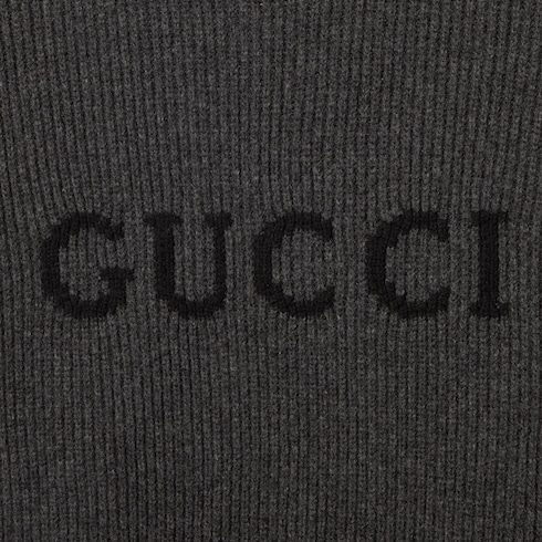 Ausgewählte Ready-To-Wear-Designs werden mit traditionsreichen Details des Hauses präsentiert. Dieser Pullover aus dunkelgrauem und schwarzem Woll- und Kaschmir-Rippstrick erhält durch eine Gucci Intarsie einen unverkennbaren Akzent.