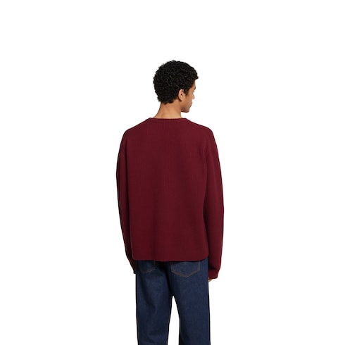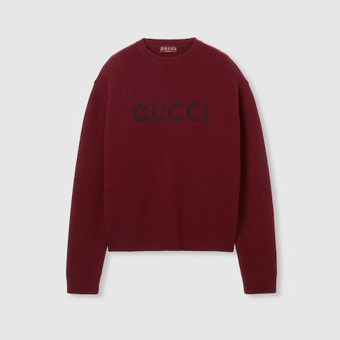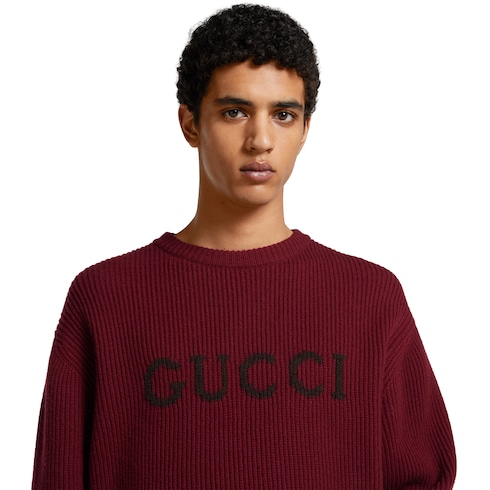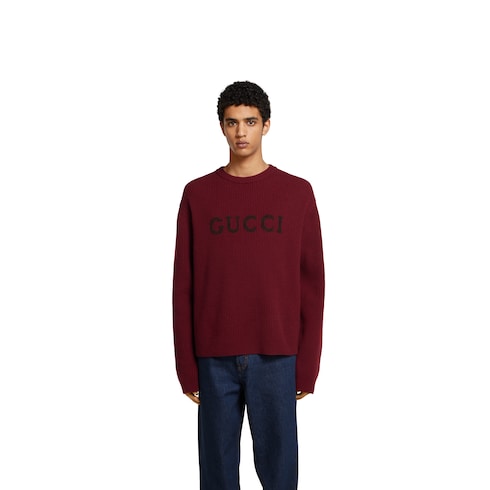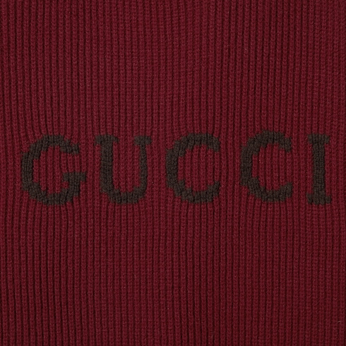 Ausgewählte Ready-To-Wear-Designs werden mit traditionsreichen Details des Hauses präsentiert. Dieser Pullover aus Woll- und Kaschmir-Rippstrick in Gucci Rosso Ancora Rot und Braun erhält durch eine Logo-Intarsie einen unverkennbaren Akzent.