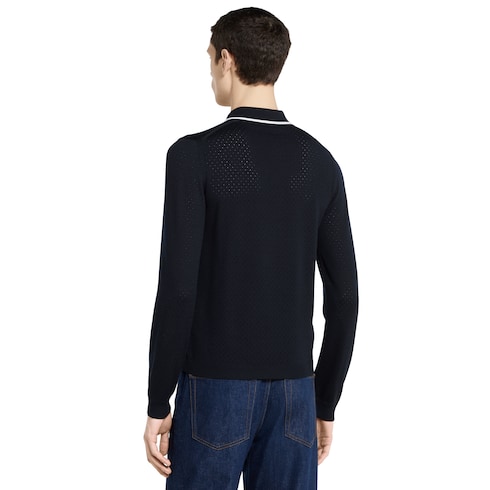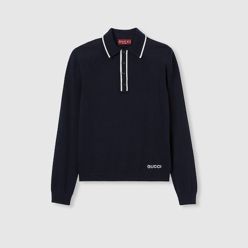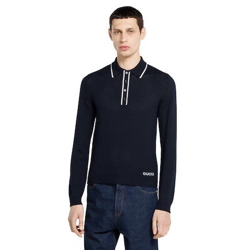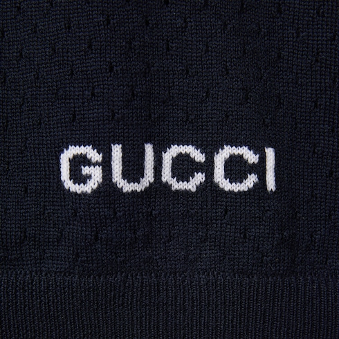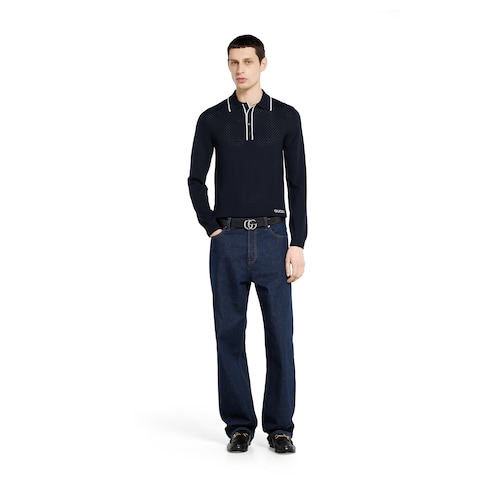 Die Anzüge und formellen Designs aus der Pre-Fall 2025 Kollektion sind von Freizeitmode inspiriert und rücken neue Silhouetten und Schnitte in den Fokus. Charakteristische Elemente treffen dabei auf elegante Details. Dieses Poloshirt aus feinem Wollstrick mit Lochmuster wird von einer Gucci Intarsie akzentuiert.