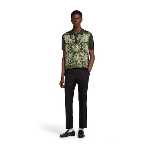 Mehrfarbige Prints und lässige Silhouetten im Boho-Stil kennzeichnen ausgewählte Ready-To-Wear-Designs aus der Pre-Fall 2025 Kollektion. Dieses Poloshirt aus waldgrünem Seiden- und Baumwollstrick zeichnet sich durch einen durchgehenden Bandana-Print aus.