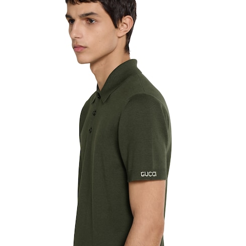 Die Pre-Fall 2025 Kollektion umfasst essenzielle Silhouetten mit symbolträchtigen Details für den Tag und den Abend. Dieses klassische Poloshirt ist aus waldgrünem Seiden- und Baumwollstrick gefertigt und wird am Ärmel von einer Gucci Intarsie geziert.