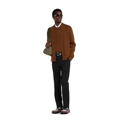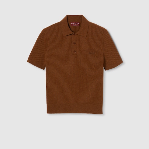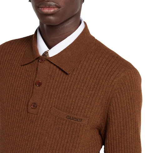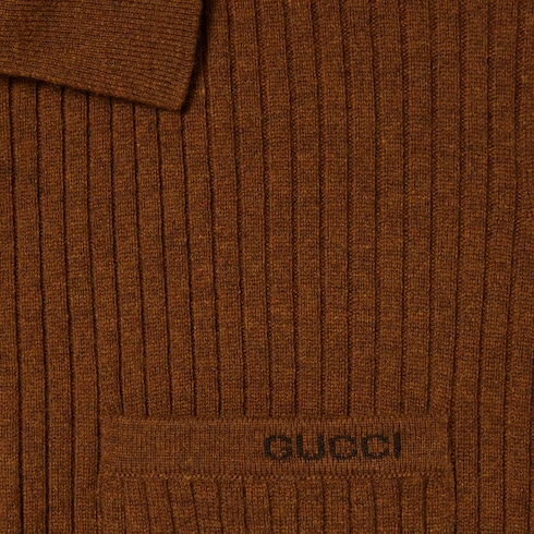 Die Pre-Fall 2025 Kollektion umfasst Designs in gedeckten Schwarz-, Grau- und Grüntönen, auf denen zarte Blumen-Stickereien, geprägte Logos und andere aufwendig gearbeitete Details auf besondere Weise in den Fokus rücken. Dieses Poloshirt aus Woll- und Kaschmir-Rippstrick wird von einer Gucci Intarsie geziert.