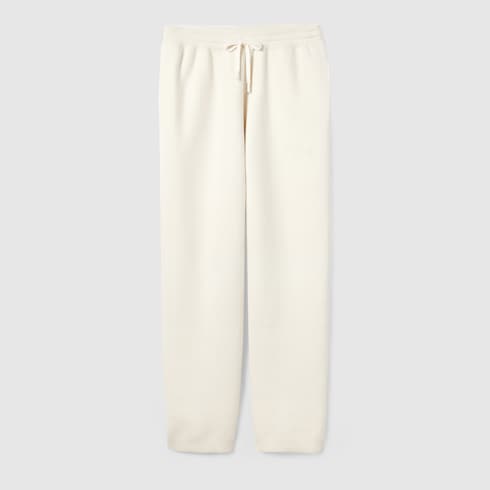 In der Kollektion verschmelzen weiche, strukturierte Materialien und raffinierte Details zu eleganten Winter-Essentials. Diese Freizeithose aus weißem Piqué-Strick aus Wolle und Kaschmir zeichnet sich durch ein geprägtes Gucci Logo aus.