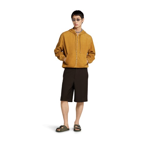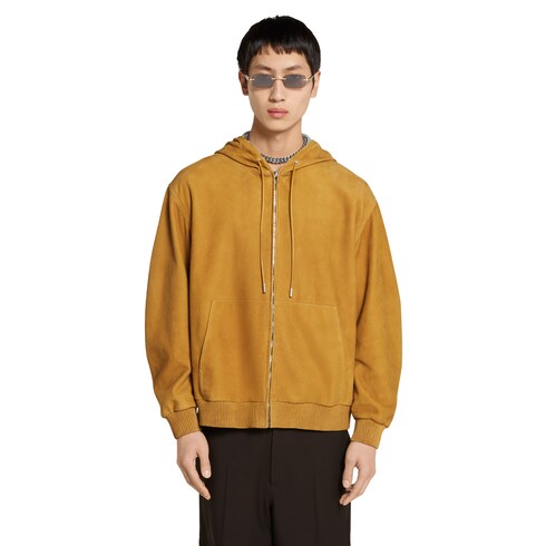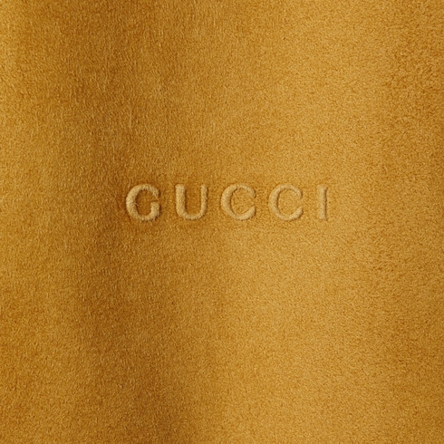 Die Pre-Fall 2025 Kollektion umfasst legere Silhouetten mit dem Logo des Hauses und maritimen Designs wie Streifen- und Anker-Motiven, die zu einem Ausflug ans Meer einladen. Dieses camelfarbene Sweatshirt mit Reißverschluss ist aus mit Baumwolljersey gebondetem, leichtem Wildleder gefertigt. Ein geprägtes Gucci Logo komplettiert den Look.