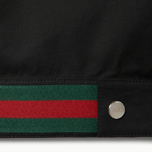 2025早秋系列选用低调的黑色、灰色与绿色调,巧妙点缀精致花卉刺绣、压花标识等工艺细节,尽显别致魅力。这款夹克以黑色斜纹棉打造,后幅匠心缀饰织带细节,巧妙融入Gucci印花压纹标识。