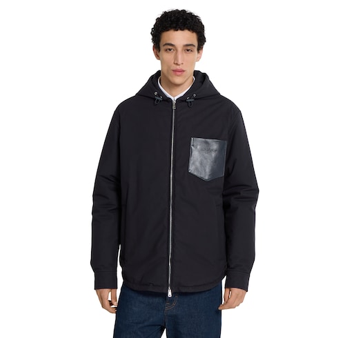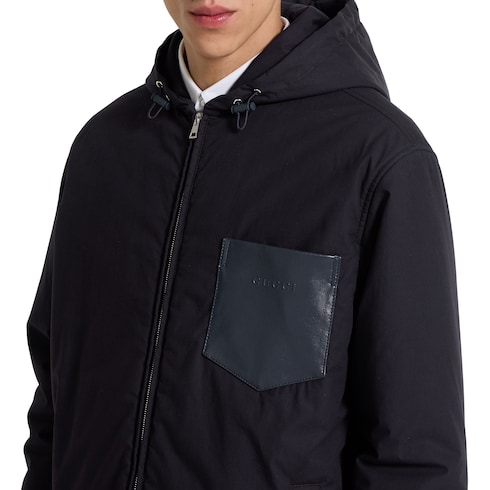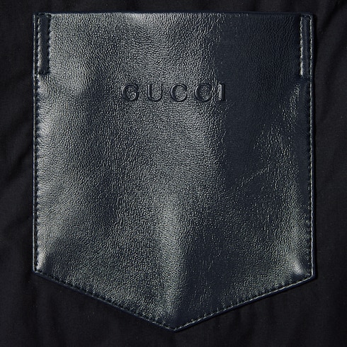 In der Pre-Fall 2025 Kollektion treffen vielfältige Strukturen auf raffinierte Details. Diese wattierte Jacke aus dunkelblauem Baumwollpopeline verfügt über eine Brusttasche aus Leder mit geprägtem Gucci Logo.