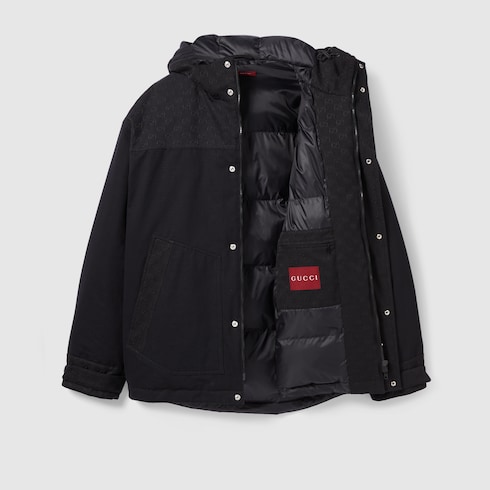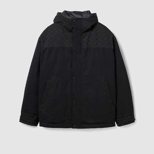 Weiche, strukturierte Materialien prägen ausgewählte Winter-Essentials für City-Streifzüge und eindrucksvolle Bergmomente. Diese wattierte Jacke aus schwarzer Ripstop-Baumwolle wird von Einsätzen aus GG Canvas geziert.