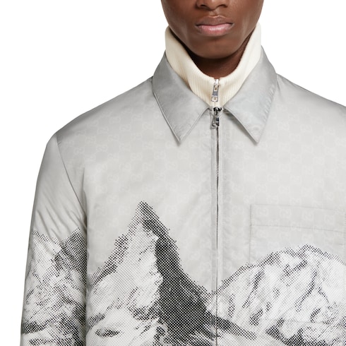 Weiche, strukturierte Materialien prägen ausgewählte Winter-Essentials für City-Streifzüge und eindrucksvolle Bergmomente. Diese Jacke aus schwarzem und weißem Nylon wird von einem GG Berglandschafts-Print geziert.