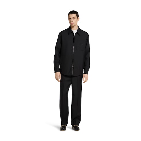 Die Pre-Fall 2025 Kollektion umfasst Designs in gedeckten Schwarz-, Grau- und Grüntönen, auf denen zarte Blumen-Stickereien, geprägte Logos und andere aufwendig gearbeitete Details auf besondere Weise in den Fokus rücken. Dieses wattierte Overshirt aus schwarzem Polyester-Wolltwill wird von einem Gucci Schriftzug-Detail aus Metall komplettiert.
