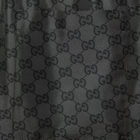 Die Kombination verschiedener Strukturen, Motive und Farben verleiht den Designs aus der Pre-Fall 2025 Kollektion ein besonderes Flair. Diese Shorts aus grauem und schwarzem Seidentwill sind mit einem durchgehenden GG Print versehen.