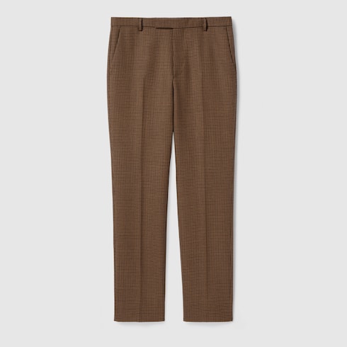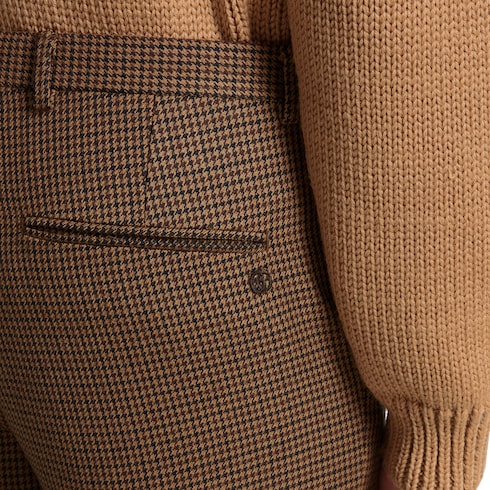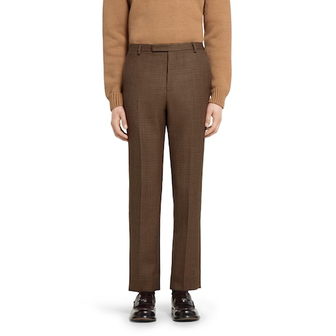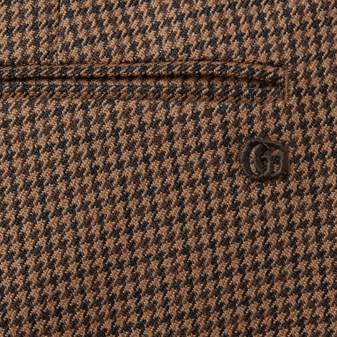 Herbstliche Farben bestimmen eine Auswahl an formellen Designs mit traditionsreichen Details des Hauses. Diese Hose ist aus beigefarbener und dunkelbrauner Wolle mit Hahnentrittmuster gefertigt und wird von einer Doppel G Stickerei akzentuiert.