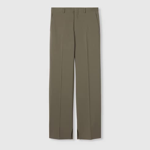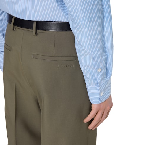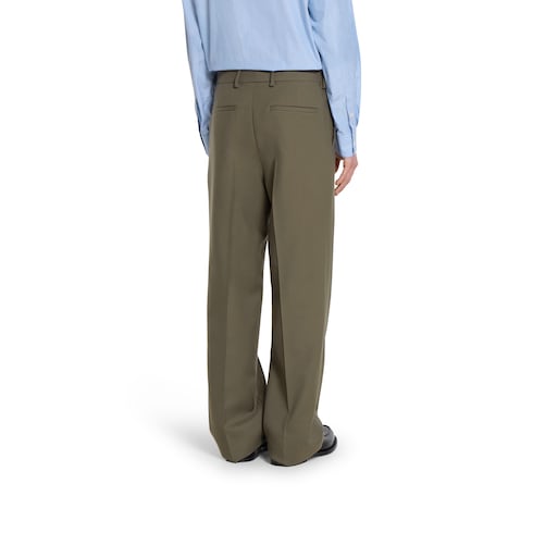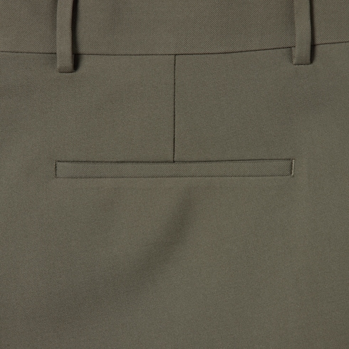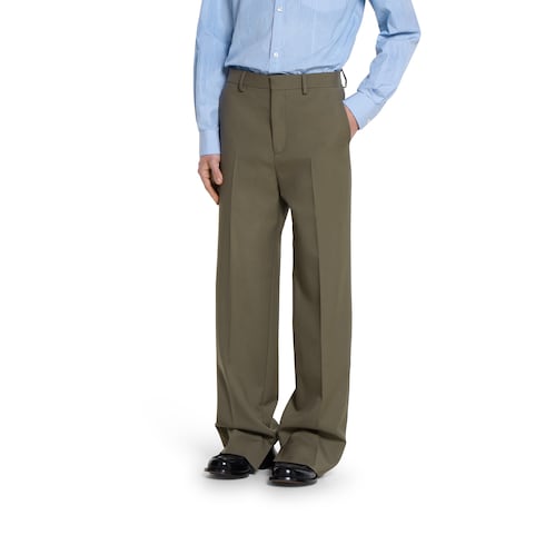 Die Anzüge und formellen Designs aus der Pre-Fall 2025 Kollektion sind von Freizeitmode inspiriert und rücken neue Silhouetten und Schnitte in den Fokus. Charakteristische Elemente treffen dabei auf elegante Details. Diese Hose aus waldgrünem Wollgabardine wird von einer Logo-Stickerei geziert.