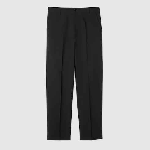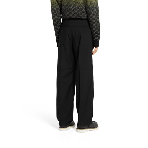 Die Anzüge und formellen Designs aus der Pre-Fall 2025 Kollektion sind von Freizeitmode inspiriert und rücken neue Silhouetten und Schnitte in den Fokus. Charakteristische Elemente treffen dabei auf elegante Details. Diese Hose aus schwarzem Wollgabardine wird von einer Gucci Stickerei geziert.