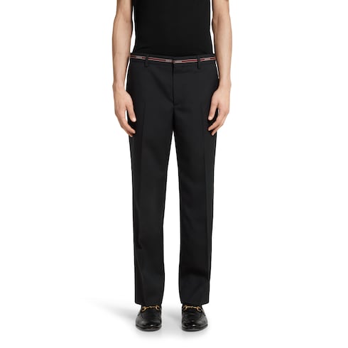 Details wie die Gucci Webkante oder der Gucci Vintage-Logo-Print verleihen Alltagslooks ein urbanes Flair. Diese Hose aus dunkelblauer Wolle erhält durch ein rotes Gucci Webkanten-Detail in Taillenhöhe eine elegante Note.