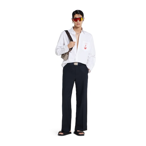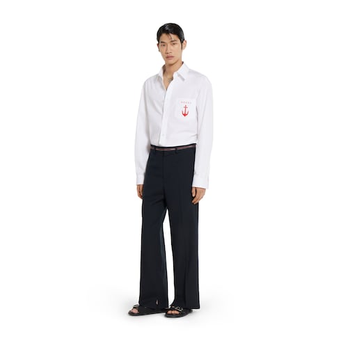 Details wie die Gucci Webkante oder der Gucci Vintage-Logo-Print verleihen Alltagslooks ein urbanes Flair. Diese Hose aus dunkelblauer Wolle zeichnet sich durch ein Gucci Webkanten-Detail in Taillenhöhe aus.