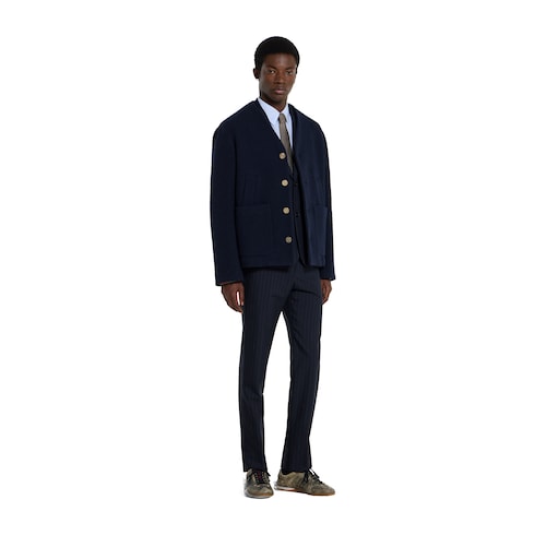 Die Designs aus der Cruise 2026 Herrenkollektion gleichen einer Reise durch Vergangenheit und Gegenwart und schöpfen ihre Inspiration dabei aus den Archiven von Gucci. Dieses Hemd aus dünn gestreifter Baumwolle in Hellblau und Weiß wird von einem roten und grünen Web-Besatz komplettiert.