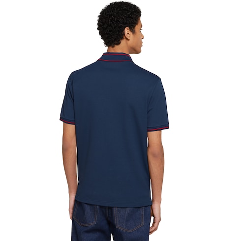 Das Haus setzt seine Reise in die Tenniswelt fort, die in den 1970ern ihren Anfang nahm. Präsentiert werden dabei unverwechselbare Designs aus innovativen Materialien mit dem Gucci Web und anderen klassischen Details. Dieses Poloshirt aus marineblauem Baumwoll-Piqué ziert ein Gucci Jacquard-Detail am Kragen.