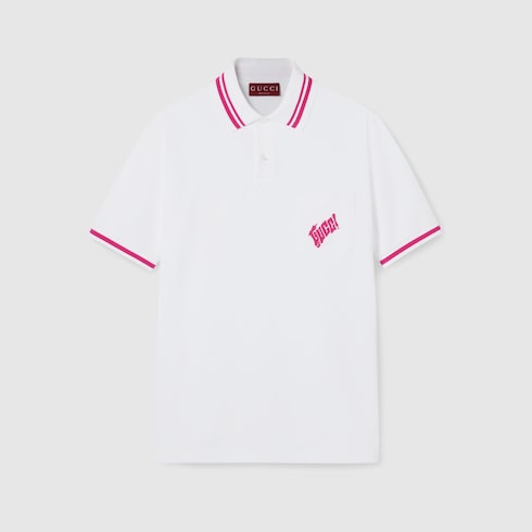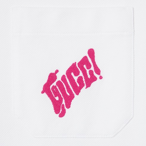Für die Pre-Fall 2025 Kollektion erscheint das Logo des Hauses in einem neuen Artwork des chinesischen Künstlers Currynew (Xiang Zhang) auf Ready-To-Wear-Looks, Lederwaren und Accessoires für Herren. Dieses Poloshirt aus weißem Baumwoll-Piqué verfügt über eine Gucci Stickerei.