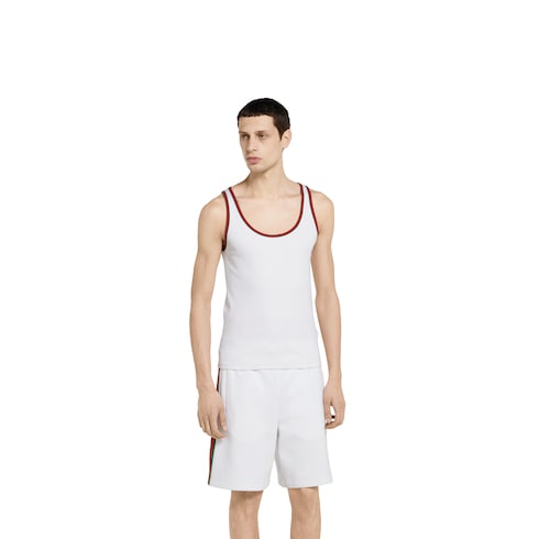 Das Haus setzt seine Reise in die Tenniswelt fort, die in den 1970ern ihren Anfang nahm. Präsentiert werden dabei unverwechselbare Designs aus innovativen Materialien mit dem Gucci Web und anderen klassischen Details. Dieses Tanktop aus weißer, gerippter Baumwolle ist mit einem Web-Besatz versehen.