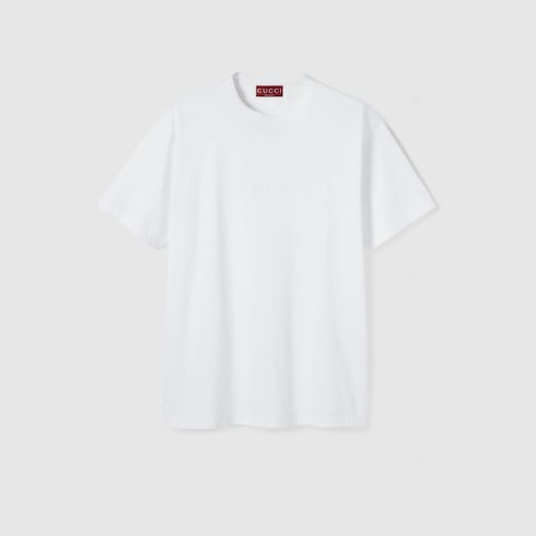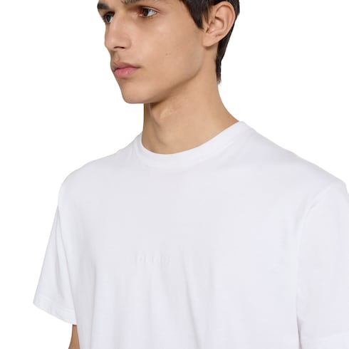 Die Pre-Fall 2025 Kollektion umfasst essenzielle Silhouetten mit symbolträchtigen Details für den Tag und den Abend. Dieses T-Shirt aus weißem Baumwolljersey erhält durch eine Gucci Stickerei einen besonderen Akzent.