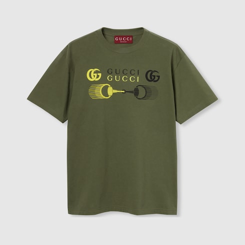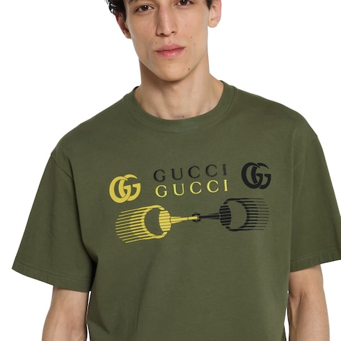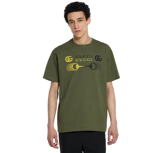Von Modellen aus Seide mit Horsebit-Print bis hin zu Oberteilen aus Häkelstrick: Die Kombination verschiedener Strukturen, Motive und Farben verleiht den Designs aus der Pre-Fall 2025 Kollektion ein besonderes Flair. Dieses normal geschnittene T-Shirt aus waldgrünem Baumwolljersey erhält durch einen Horsebit-Print mit Doppel G einen besonderen Akzent.