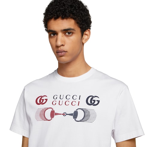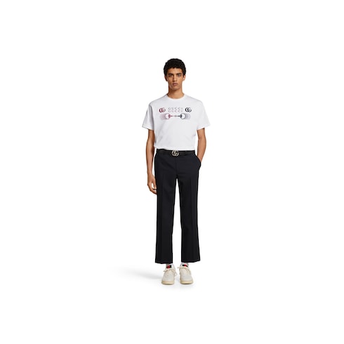 Ausgewählte Ready-To-Wear-Designs werden mit traditionsreichen Details des Hauses präsentiert. Dieses T-Shirt mit normaler Passform ist aus weißem Baumwolljersey gefertigt und zeichnet sich durch einen Doppel G Print mit Horsebit sowie eine dezente Logo-Stickerei aus.
