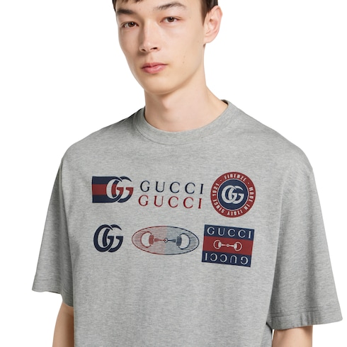 Ausgewählte Ready-To-Wear-Designs werden mit traditionsreichen Details des Hauses präsentiert. Dieses T-Shirt mit übergroßer Passform ist aus hellgrauem Baumwolljersey gefertigt und zeichnet sich durch einen Print mit Gucci Symbolen sowie eine dezente Logo-Stickerei aus.