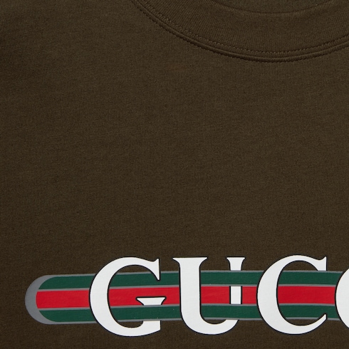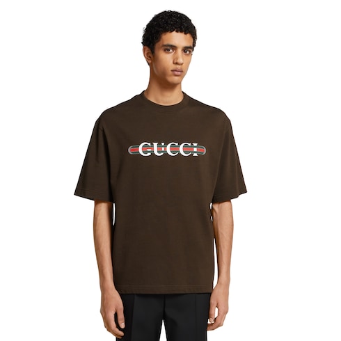 Die Pre-Fall 2025 Kollektion umfasst essenzielle Silhouetten mit symbolträchtigen Details für den Tag und den Abend. Dieses T-Shirt aus braunem, schwerem Baumwolljersey wird von einem Gucci Print mit Web geziert.
