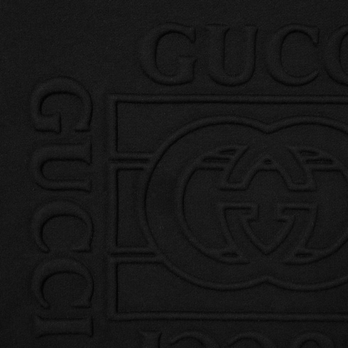 Ein von den Archiven inspiriertes Logo ziert vielseitige Modelle aus Baumwollstoffen und setzt ein dezentes und dennoch unverkennbares Statement in der Garderobe. Dieses Sweatshirt mit Gucci GG Prägung ist aus schwarzem, gebürstetem Baumwolljersey gefertigt.