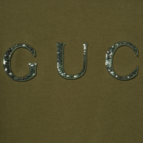 Kristall-Stickereien bilden einen funkelnden strukturellen Kontrast zu symbolträchtigen Materialien des Hauses wie dem GG Canvas, technischem Jersey, Baumwolljersey und Baumwoll-Piqué. Dieses Sweatshirt mit Kapuze ist aus Baumwolljersey gefertigt und wird von einer Gucci Logo-Stickerei mit Pailletten geziert.
