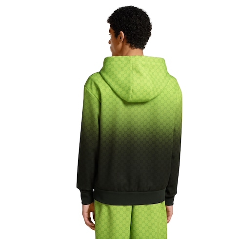 Präzise gestaltete Farbverläufe lassen die Struktur der verwendeten Materialien und des unverkennbaren GG Motivs in den Vordergrund treten. Diese Reißverschlussjacke aus leichtem Neopren kombiniert ein Farbverlaufdesign von Limettengrün zu Schwarz mit einem durchgehenden GG Print in Dégradé-Optik.