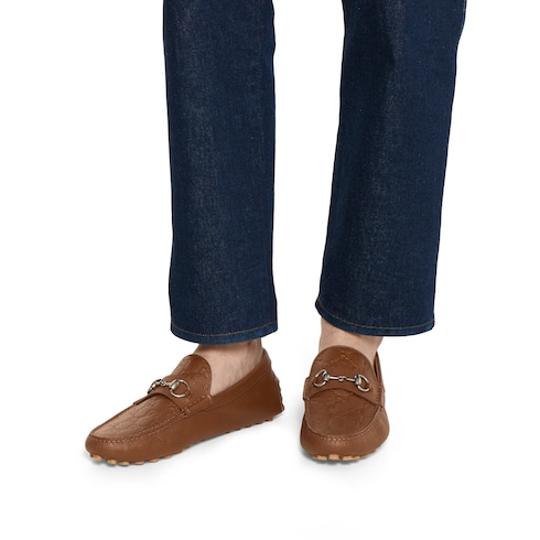 Inspiriert von der Reitsportvergangenheit des Hauses hat sich das Horsebit im Laufe der Jahre zu einem historischen Symbol entwickelt. Bei diesem Driver-Mokassin aus braunem, geprägtem GG Leder sorgt das Detail für einen unverkennbaren Touch.