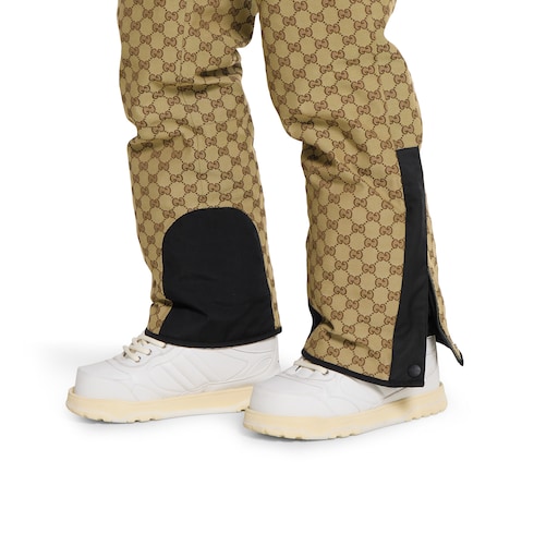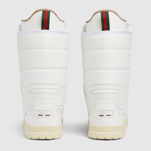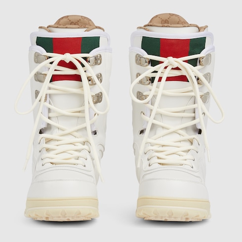 Als erste Wintersportkollektion des Hauses kombiniert Gucci Altitude funktionales Design mit charakteristischen Codes. Auch dieser Herrenstiefel rückt unverkennbare Elemente in den Fokus. So findet sich das grüne und rote Web auf der Zunge und in Form von weiteren Details wieder und verleiht der funktionalen Silhouette einen Hauch von Logo-Feeling.