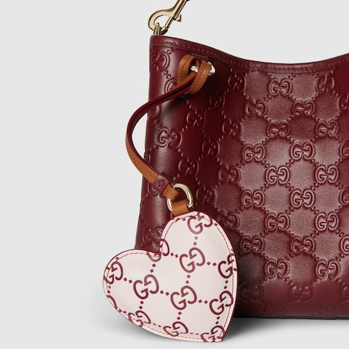 In der Herbst Winter 2025 Kollektion, für die Herbst Winter 2025 Kollektion werden ausgewählte Accessoires präsentiert, die die unverwechselbare Handschrift des Hauses widerspiegeln. Dieser Taschenanhänger zeigt ein herzförmiges Motiv aus geprägtem GG Leder und wird durch ein rundes GG Detail ergänzt.