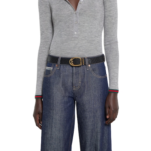 Eine elegante Steigbügelschnalle ziert ausgewählte Damengürtel passend zu einer Reihe von Ready-To-Wear-Looks. Hier erscheint das Detail in einer gravierten Version zusammen mit einem Gürtel aus geprägtem GG Leder.