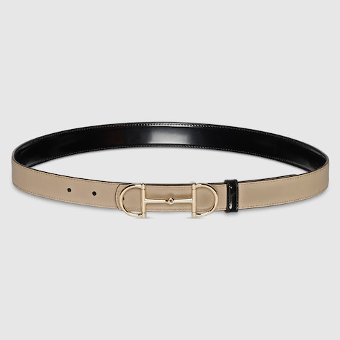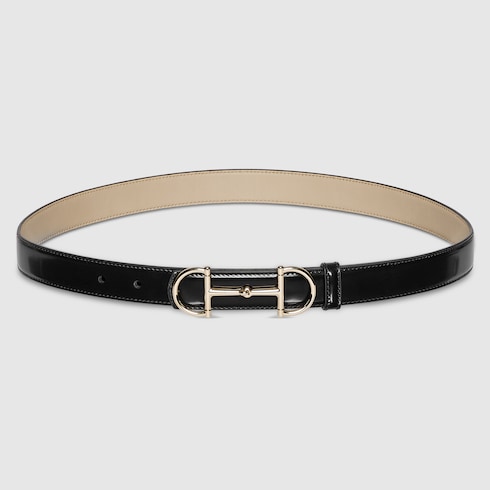 Als eines der beliebtesten Symbole des Hauses lässt das Horsebit das Reitsporterbe von Gucci lebendig werden. Dieser schmale Gürtel mit hellgoldfarbener Horsebit-Schnalle ist aus hochglänzendem Leder gefertigt und verfügt über eine Wendeseite aus Glattleder.