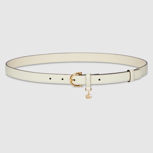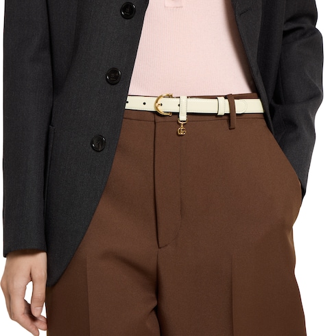 Mit seiner Steigbügelschnalle und einem Doppel G Anhänger verkörpert dieser schmale Gürtel aus der Herbst Winter 2025 Kollektion das traditionsreiche Erbe von Gucci. Das Modell aus elfenbeinfarbenem Leder zeichnet sich durch eine elegante und zugleich mühelos-leichte Ästhetik aus.