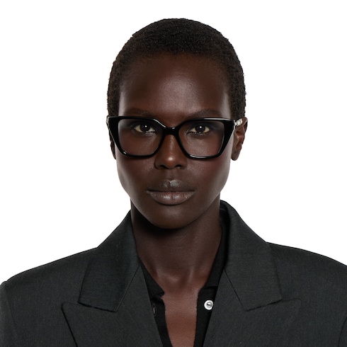 Für die Eyewear-Looks aus der Pre-Fall 2025 Kollektion verschmelzen Statement-Silhouetten aus den Archiven mit zeitgemäßen Elementen. Dieses Brillengestell in Katzenaugenform besteht aus schwarzem Azetat und silberfarbenem Metall, das von Kristallnieten und einem GG Cut-out-Detail geziert wird.
